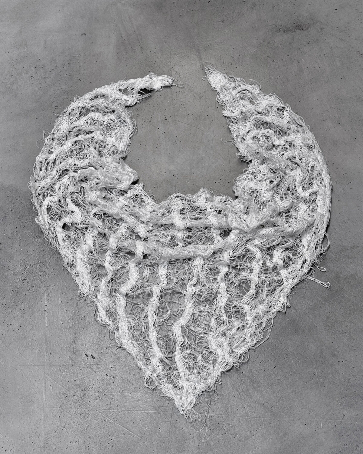 Entirely handcrafted from optic white yarns, the bandana is finished by raw frayed edges, complimenting the complex, ethereal texture.