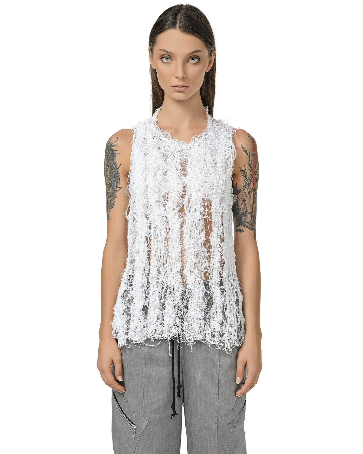 The sleeveless design features a clean round neckline, with raw frayed edges forming a deconstructed finish.