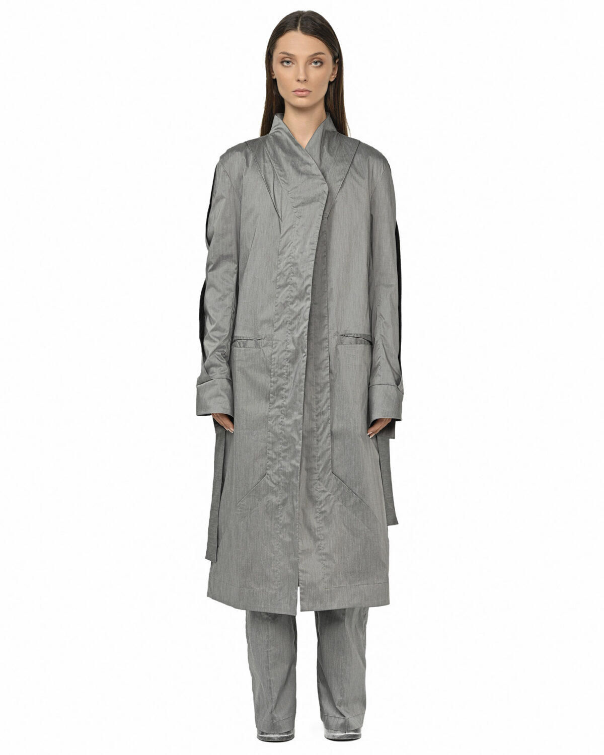 This trench coat explores the concept of Gravity through its deconstructed, geometric form, where overlapping panels and asymmetrical details appear shaped by a fundamental force.