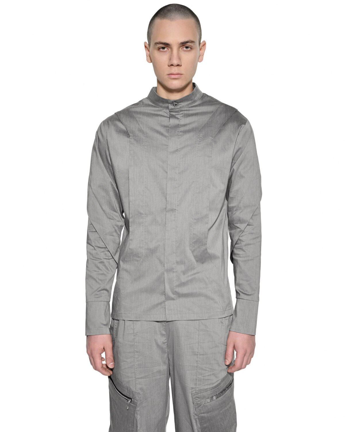 The Inox Layers Shirt features a relaxed silhouette in muted satin grey with tonal stitching and a standing collar detailed by a linear steel button at front closure and rear hexagon steel buckle.