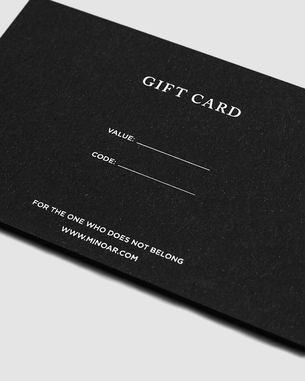 The Minoár Gift Card is crafted from thick black multi-layered paper.