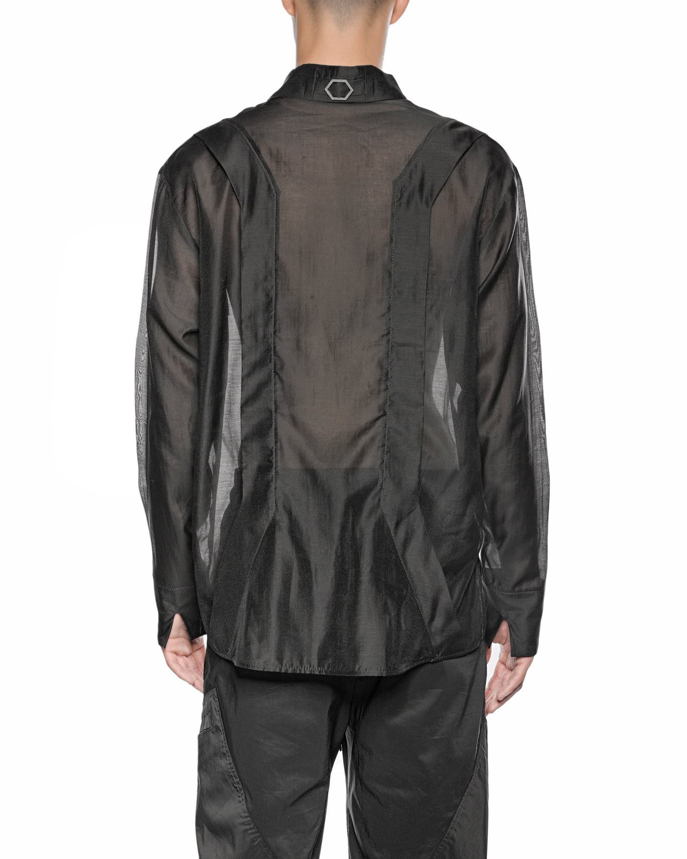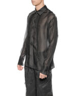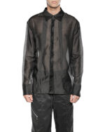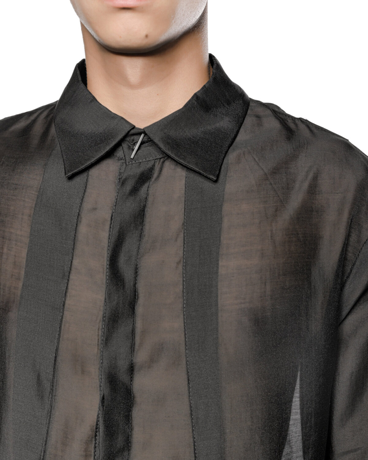 This shirt captures a sense of Radiant energy through its exceptionally lightweight, semi-sheer fabric that offers extreme comfort and an airy feel. The satin black finish gives the loose silhouette a subtle glow, creating an ethereal and sophisticated presence that prioritizes transparency and ease of wear.