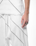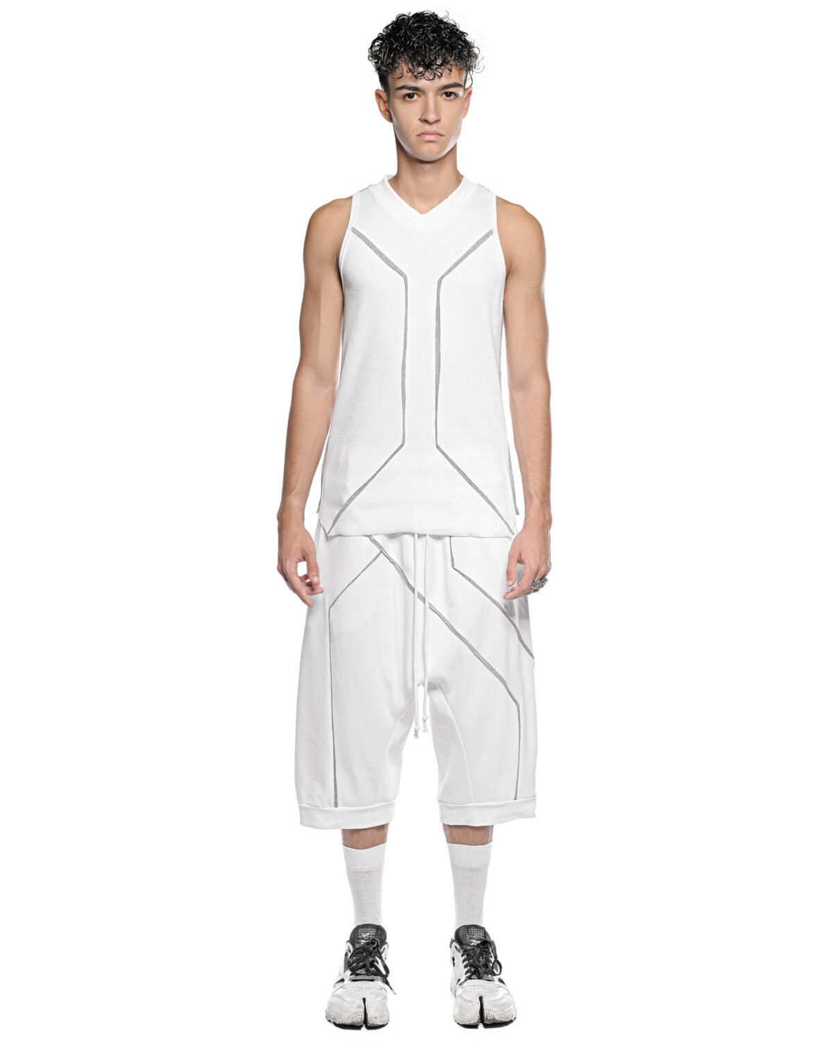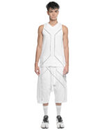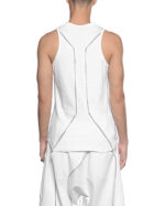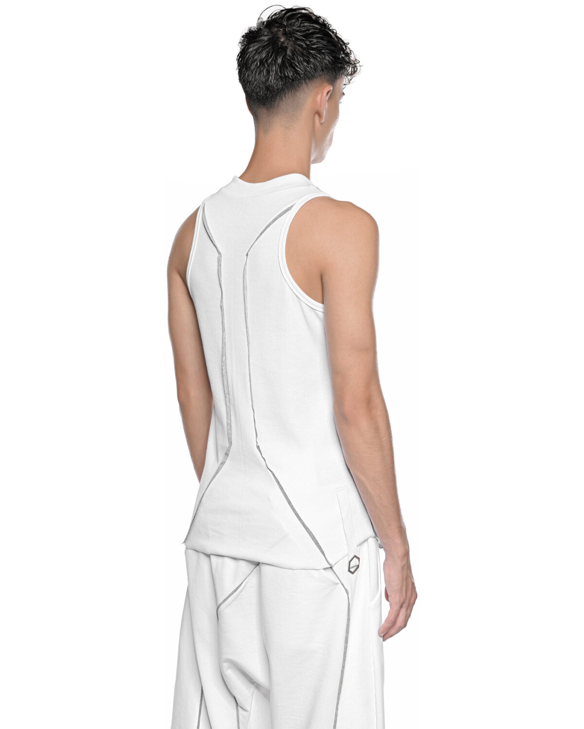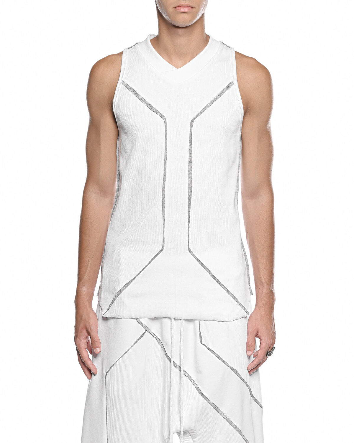 This fitted top embodies the Cluster concept, using a multi-panel geometric design and angular external seams to define its form. The ribbed knit texture provides a tactile surface, creating a foundational piece that is both visually intricate and cleanly sculpted.