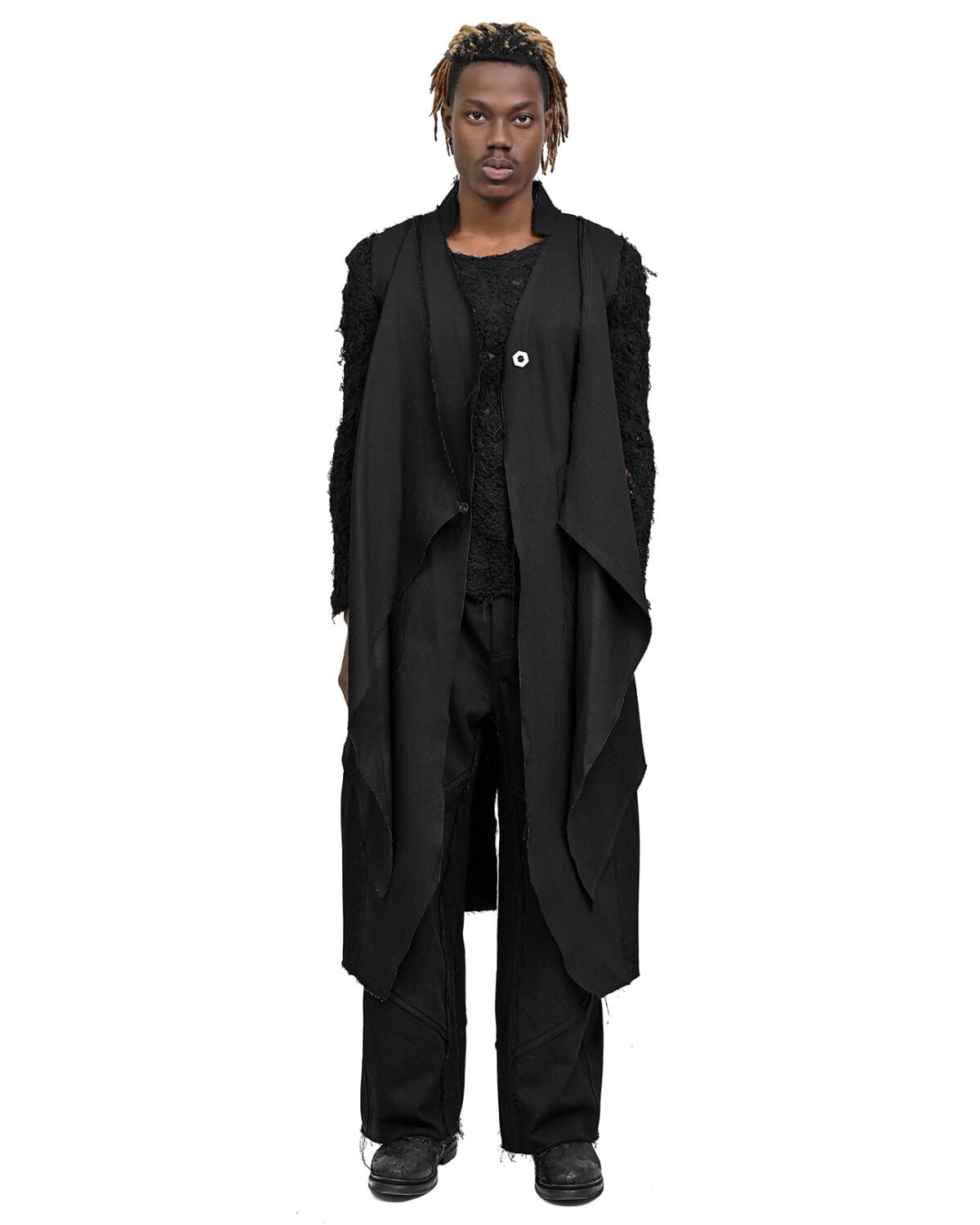 This ‘Insolitum’ garment is crafted in 100% cotton denim in pure black color in raw, untreated finish. Raw denim offers unique characteristics which begin to unveil through time and wear where the fabric will naturally begin to age beautifully and offer one of a kind appearance & fades especially noticeable at the edges. The word HEXA is tightly related to Minoar’s graphic logo abbreviation shaping a Hexagonal shape. This shape is fundamental to Minoar’s core identity. As part of collection Insolitum this item is further provoked by the concept of particle physics and the hypothetical Hexaquarks, hence deconstructed shapes of the Hexagon are implemented within the pattern & construction of this item.